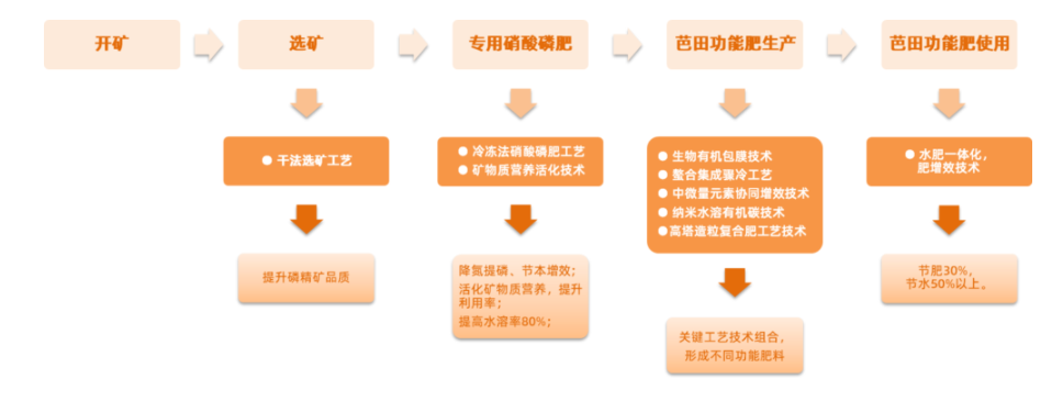 国产化首套工艺,具备国际先进水平,通过酸不溶物的高效分离,独特专利工艺产生的肥料产品,可以将磷矿中的磷和所有矿物质元素保留并活化为全水溶营养,水溶性的钙镁等矿物营养可直接被作物所吸收和利用,可提高肥料利用率30%以上,减少碳排放30%以上,有效防治面源污染,农产品品质价值提升50%以上,实现产品卖价提高50%以上。