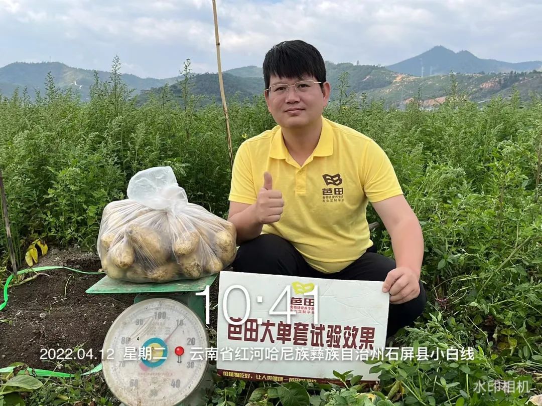 种植户蒋红斌今年是第一年用芭田品牌复肥,底肥选择的是芭田有机无机Ⅲ型复肥(16-6-16),每亩地用40Kg,苗期追肥选择的芭田水溶2号(18-7-26),开花后用的芭田果大美(13-6-28)。为了查看马铃薯的产量的质量,云红河片区的营销经理方超早早来到蒋大哥的地里,随机挑选了一平米的地块,进行评估测产。采挖的过程中,大家发现,每株的结薯量有4-6个,外表光滑,芽眼稀少,大薯率高。上称一称,足足有11公斤。
