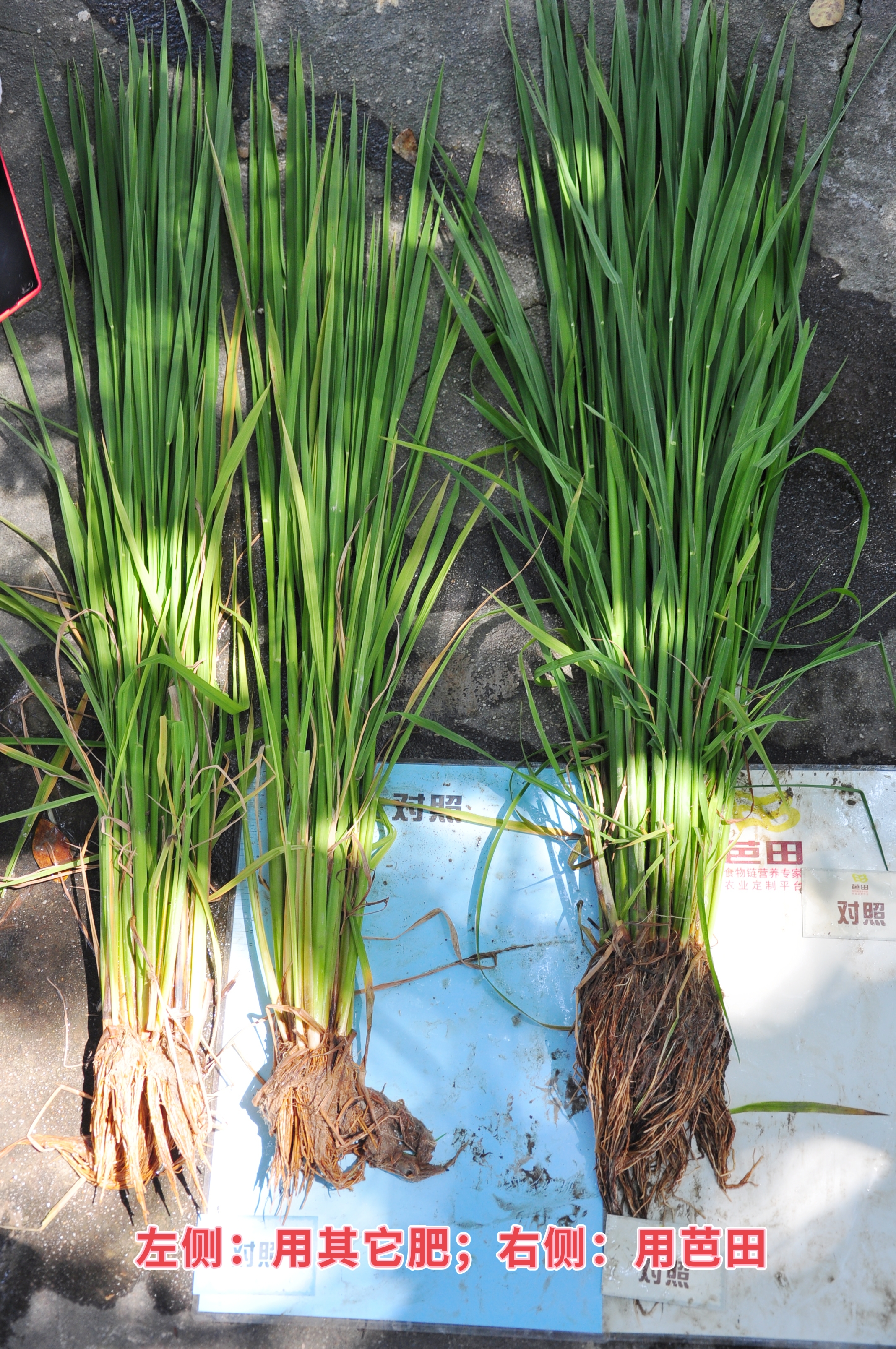 观摩会现场,芭田工作人员分别在大户朱德敏的田间和相邻地块上拔下几株水稻作对比,大家看到,施用芭田有机无机水稻肥的水稻叶色绿,叶片厚大,茎秆粗壮,分蘖多,优势一目了然。分蘖方面,施用其它牌子肥料的两株水稻分蘖数分别为19和12个,而施用芭田有机无机Ⅲ型肥料的水稻分蘖数量达39个。分蘖多,就意味着后期的水稻稻穗多,产量高。