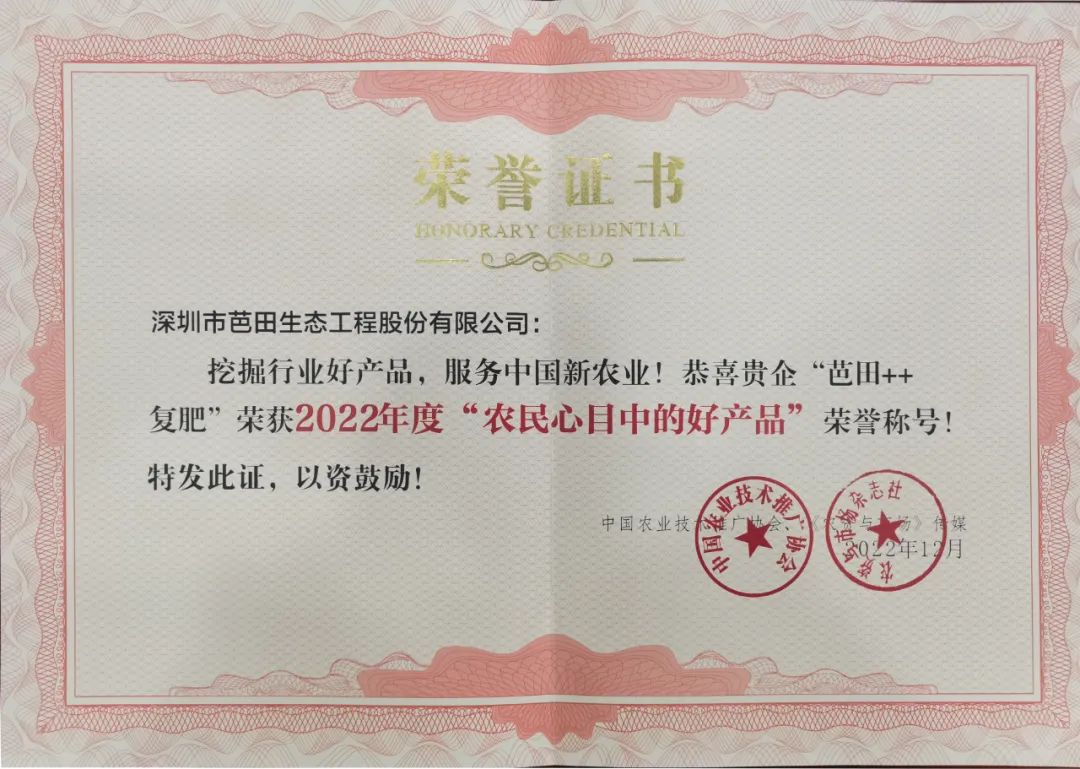 近日,中国农化行业年度领袖峰会——D25峰会以“线下+线上”双路结合形式重磅举行,会上揭晓了2022年度“农民心目中的好产品”大型评选活动结果。芭田股份旗下产品“芭田++复肥”获得2022年度“农民心目中的好产品”荣誉称号。“农民心目中的好产品”是农资与市场传媒从2011年起推出的一项大型终端调研活动,旨在挖掘并助推农资行业优秀产品,让真产品、好产品惠及全国千万农户。荣获此次殊荣,不仅是行业和农民对芭田的高度认可,更是对“芭田++复肥”产品的极大肯定。
