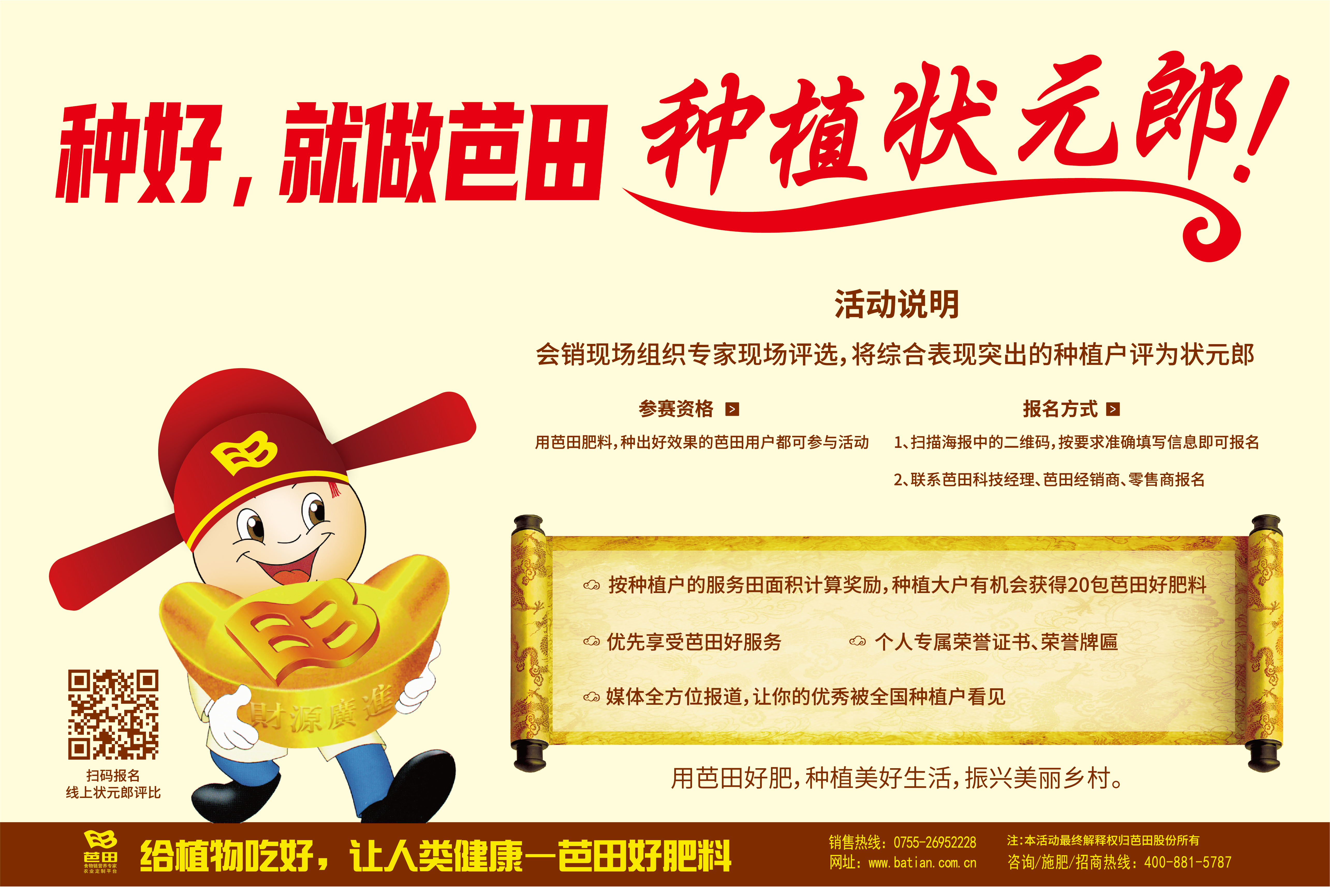 芭田活动负责人表示,“2023芭田种植状元”评选活动还在火热进行中,芭田计划在全国评选100名“种植状元”。参赛条件具体如下:1、愿意接受新观念新事物,通过研发新技术、利用新工具让生产更高效,在当地有一定影响力及示范带动作用。2、使用芭田好肥料,为芭田树标杆。参赛作物:小麦、玉米、水稻、柑橘、香蕉、苹果、西瓜、大葱、葡萄、火龙果等种植面积广的作物。希望大家积极参与,荣获“芭田种植状元”可获赠1吨芭田好肥料。