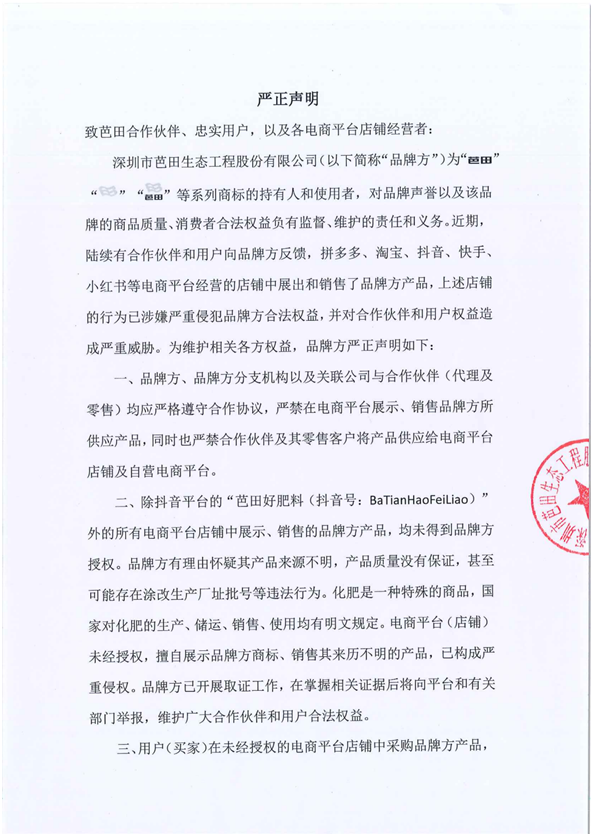 近期,陆续有合作伙伴和用户向品牌方反馈,拼多多、淘宝、抖音、快手、小红书等多个电商平台经营的店铺中展出和销售了品牌方的产品。经查实,芭田公司从未对除“芭田好肥料”(抖音号:BaTianHaoFeiLiao)外的所有电商平台以及店铺进行授权。为维护相关各方权益,芭田公司特此发布严正声明!