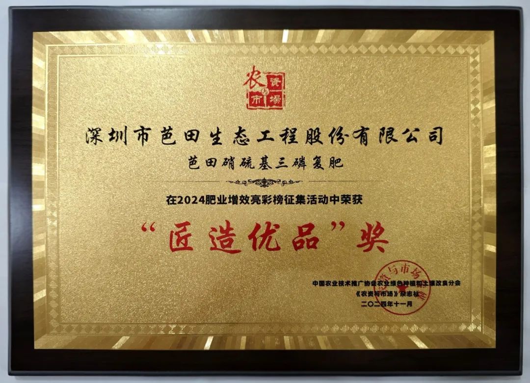 近日,由《农资与市场》传媒主办的“2025肥料增效技术发展论坛暨名优增效企业发布”活动在南京顺利举行,芭田股份旗下硝硫基三磷复肥凭借强劲的创新实力和市场影响力,成功入选2024增效肥新质力量榜单,荣获“匠造优品”奖。荣誉背后,不仅进一步夯实了芭田股份作为“首套国产化冷冻法硝酸磷肥装置技术”开创者的身份,也彰显了行业对芭田股份工艺技术以及产品的认可。