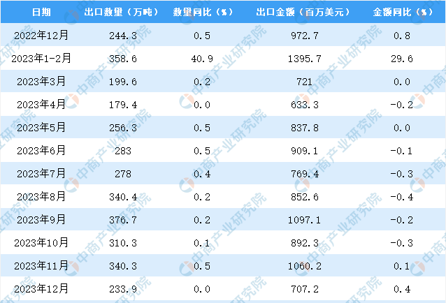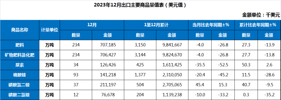 其中,12月份出口各类化肥234万吨,金额7.07亿美元。当月比2022年同期数量降幅4.0%,金额降幅26.8%;累计比2022年同期数量增幅27.3%,金额降幅13.9%。