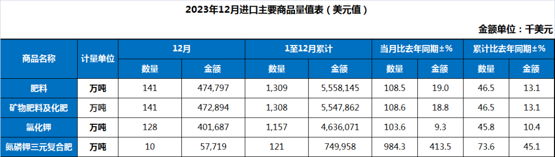 2023年全年我国共进口各类肥料1309万吨,金额55.58亿美元。其中12月份进口各类化肥141万吨,金额4.75亿美元。