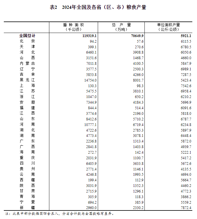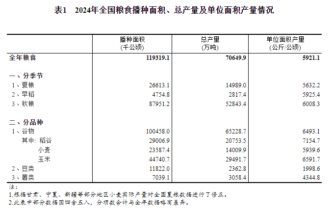 看单产,全国粮食单位面积产量5921公斤/公顷(395公斤/亩),比2023年增加75.8公斤/公顷(5.1公斤/亩),增长1.3%。其中谷物单位面积产量6493公斤/公顷(433公斤/亩),比2023年增加74.1公斤/公顷(4.9公斤/亩),增长1.2%。