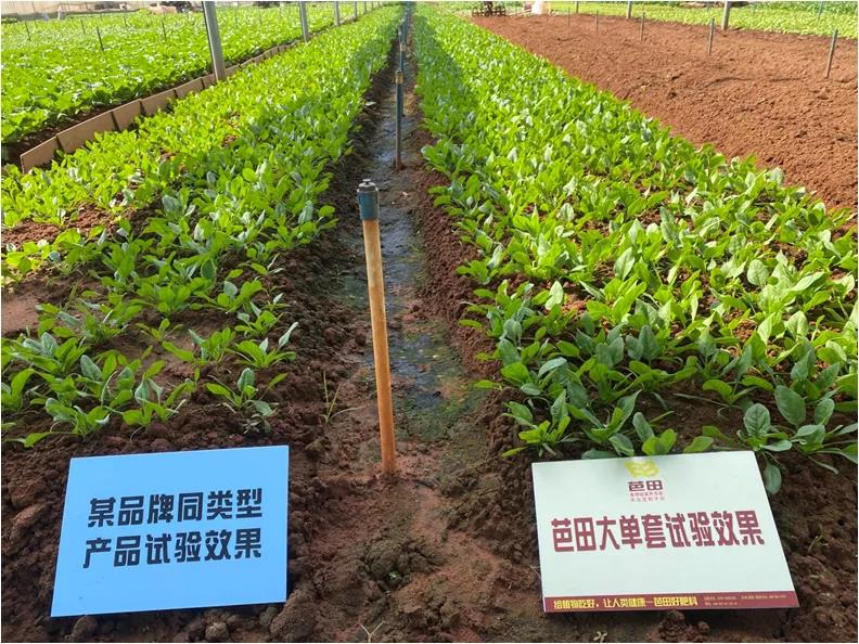 芭田服务人员告诉笔者,上个月,陆大哥的油麦菜出苗不齐,长势稀疏,营养不足,没能及早上市,卖上好价格。为此他懊悔不已。芭田服务人员拜访陆大哥时,了解到这一情况,建议他施用芭田硝酸铵钙+芭田海精灵(15-15-15)的大单套组合,并送了一些试验肥给他施用。由于之前没有用过,担心效果,陆大哥种植菠菜时特意找了相邻的两垄地做了对照试验。一垄地施用芭田硝酸铵钙+芭田海精灵(15-15-15),另一垄地施用某品牌同类型产品。