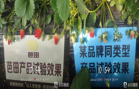 一阶段后,对比结果显示,使用芭田大单套的草莓叶片嫩绿、厚实,草莓挂果多,色泽好,个头大,卖相极佳对比优势明显,每亩增产120斤。