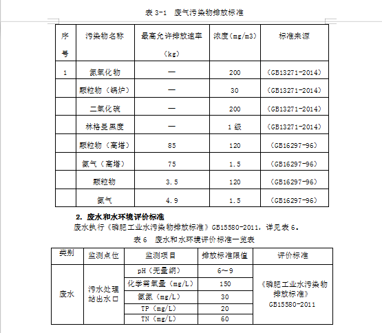 9、执行的污染物排放标准:A锅炉大气污染物排放标准GB13271-2014;大气污染物综合排放标准GB16297-1996;恶臭污染物排放标准GB14554-93;B、废水执行标准;磷肥工业水污染物排放标准GB15580-2011