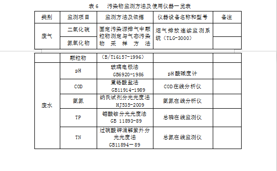 6、主要排放口排放总量: A、废气:颗粒物5.17T/a;氮氧化物99.84 T/a; B、废水:CODcr0.6 T/a;氨氮0.09T/a;总氮5.4 T/a;总磷1.8 T/a