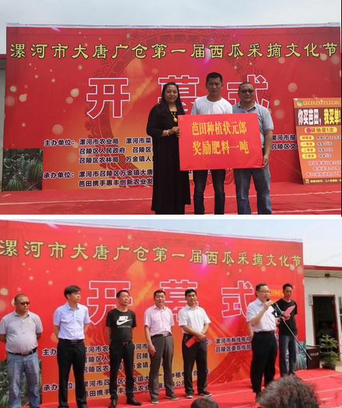 近日,由漯河市召陵区万金镇大唐广仓合作社、芭田惠丰创新发展农资公司精心策划的漯河市大唐广仓第一届西瓜采摘文化节在万金镇唐桥村隆重举行,150余名种植户踊跃前来比拼交流,活动现场热闹非凡。召陵区区委副书记赵广成、区政府副区长王仕梁,芭田股份中原营销公司河南大区总监马洛生、漯河惠丰创新发展农资公司总经理杨喜凤及相关领导参加了活动。