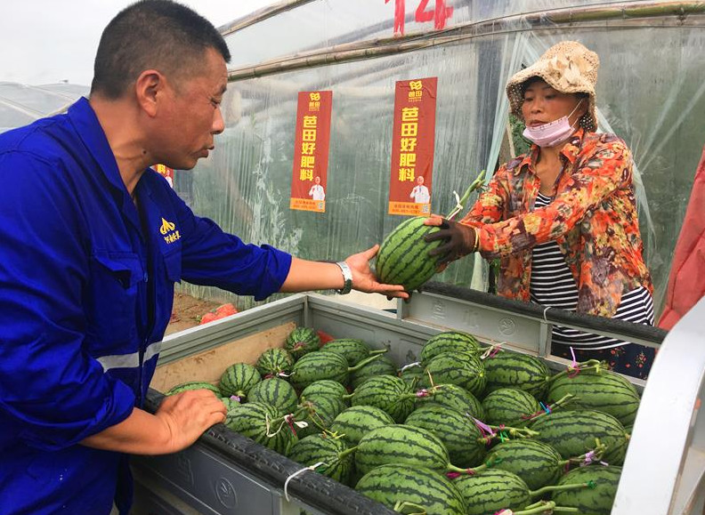 活动当天,恰逢河南平顶山小吊瓜收购商前来下订单。据收购商介绍,他们公司主营品牌瓜果,对瓜果的品质要求特别高。从去年开始,他们接触到了大唐广仓唐亚斌老板的大棚小吊瓜,并批量收购。第一批西瓜运输到平顶山后,当天便销售了2500多公斤,效果远远超出了预期。由于本次收购的西瓜品质好,口感佳,深受消费者欢迎。今年,他们公司打算在漯河当地收购20万斤大棚小吊瓜,而优先收购使用芭田肥的西瓜。