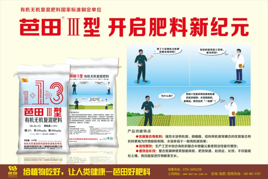 从化肥农药“零增长”行动,到新的国家有机无机肥料标准的公布,国家一直在为行业指明方向:未来的肥料产品就是要有机无机相结合,降本、提质、增效、绿色、环保。芭田研发的有机-无机Ⅲ型复肥,不仅含有优质的复合有机原料,还含有腐植酸、结构有机质、强效水溶有机碳三种营养,能够满足作物整个生长期对营养的需求,具有良好的经济效益和环境效益。