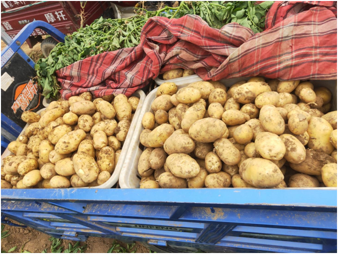 5月9日清晨,云梦县隔蒲潭镇府河村热闹非凡。一辆辆三轮车拖着成筐颜色金黄的土豆穿梭在田间地头,一片繁忙的收获景象。